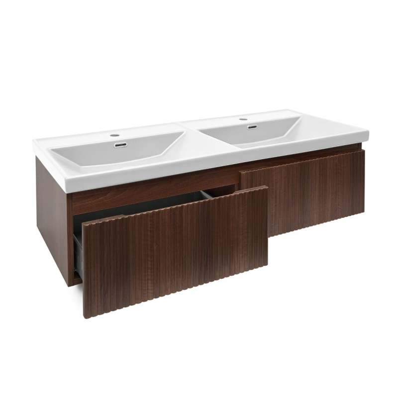 Závěsná koupelnová skříňka s keramickým umyvadlem v barevném provedení ořech aida s matným povrchem o rozměru 118x30x44,8 cm. Povrch v provedení lamino.