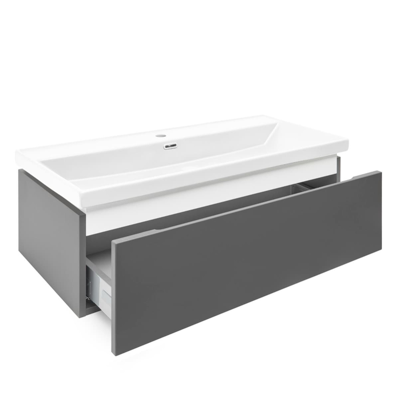 Závěsná koupelnová skříňka s keramickým umyvadlem v antracitové barvě s matným povrchem o rozměru 100x30x44,8 cm. Povrch v provedení lamino.