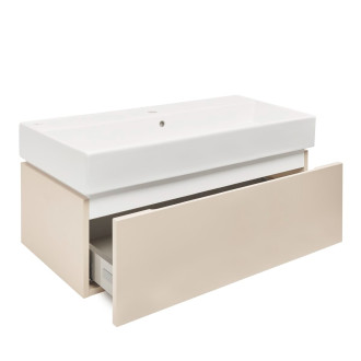 Závěsná koupelnová skříňka s keramickým umyvadlem v barevném provedení pískově béžová s matným povrchem o rozměru 100x30x46 cm. Povrch v provedení lamino.
