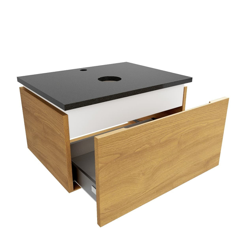 Závěsná koupelnová skříňka s žulovou krycí deskou v barevném provedení medový dub s matným povrchem o rozměru 60x30x46 cm. Povrch v provedení lamino.