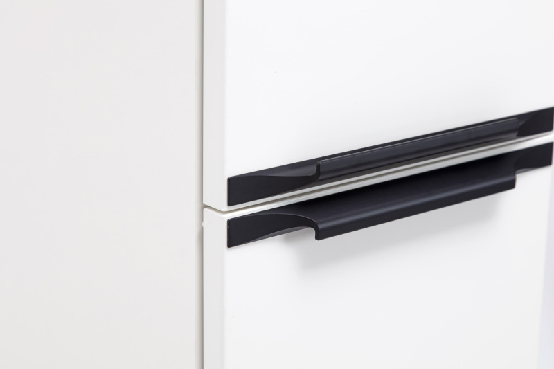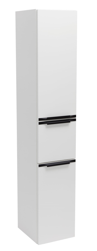 Vysoká skříňka do koupelny 158 cm, bílá lesk, se dvěma dvířky a malou zásuvkou, černé matné úchytky.