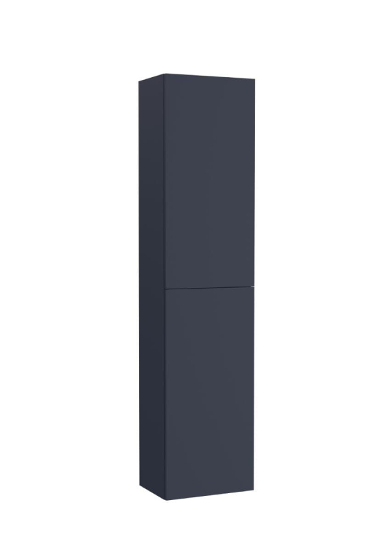 Závěsná koupelnová skříňka vysoká v barevném provedení modrá s matným povrchem o rozměru 35x150x25 cm. Povrch v provedení lamino. S plnovýsuvem a dotahem.