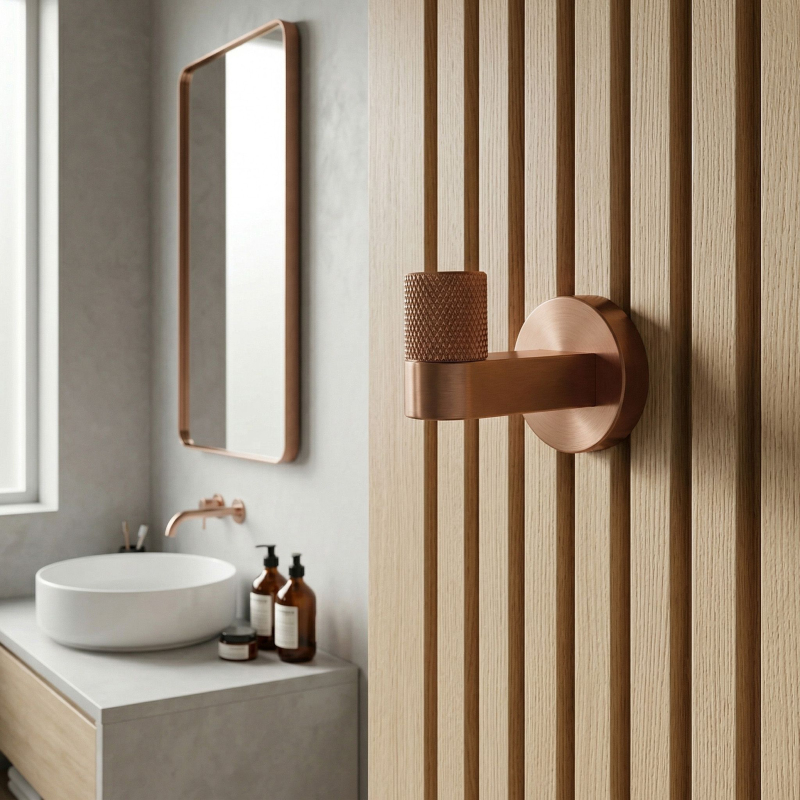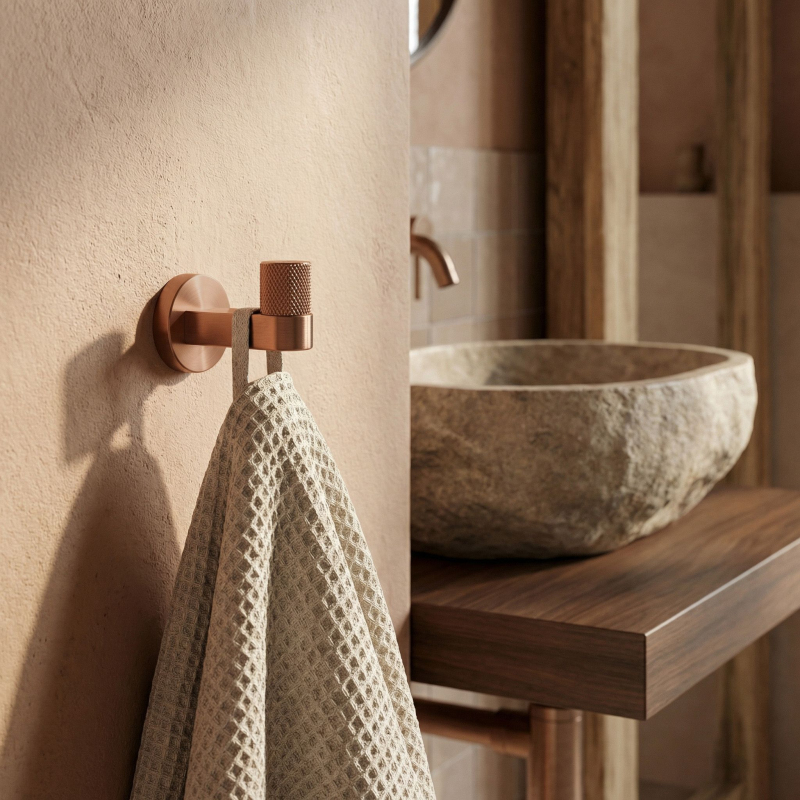 Dbejte na pořádek a elegantní detail ve své koupelně s bodovým koupelnovým věšákem Ori v barvě kartáčované mědi. Tento stylový, kompaktní háček dokonale zapadá do nejnovějších trendů a kombinuje minimalistickou formu se šperkovým zakončením.Povrchová úprava kartáčovaná měď – hluboký, teplý odstín mědi dodává interiéru elegantní a neotřelý charakter. Kartáčovaný povrch usnadňuje údržbu a účinně maskuje drobné stopy používání.Ozdobné vroubkování – přední část věšáku byla obohacena o precizní, vroubkovanou strukturu. Tento decentní, rýhovaný detail představuje jedinečnou ozdobu, která přitahuje pohled a zdůrazňuje vysokou kvalitu zpracování produktu.Robustní kovová konstrukce – vyrobení z vysoce kvalitního kovu zaručuje plnou stabilitu, odolnost a odolnost proti vlhkosti v koupelně, ideálně se hodí i pod váhu ručníků nebo županů.Pevná montáž na stěnu – věšák se upevňuje na vruty, což zajišťuje maximální bezpečnost při každodenním používání. Skrytý systém upevnění umožňuje zachovat dokonalou estetiku na stěně.Kompletní kolekce – v naší nabídce najdete i další doplňky ze série Ori, díky čemuž vytvoříte ucelené a harmonické uspořádání celého interiéru.Výběrem koupelnového věšáku Ori kartáčovaná měď volíte ideální spojení moderního designu s napolehlivou funkčností.