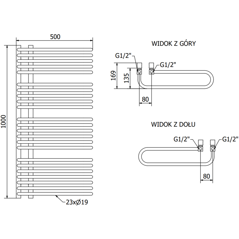 Technické údaje: Výška: 1000 mm Šířka: 500 mm Hloubka: 135 mm Rozteč připojení: 8 cm Barva: Černá RAL 9005 Materiál: Ocel Hmotnost: 13,91 kg Reakce na oheň: A1 Provozní teplota: max. 95 °C Maximální provozní tlak: 0,6 MPa Topný výkon: - 75/65/20 °C - 809 W Připojení: - 4xG ½″ shora a zdola na pravé nebo levé straně Možnost instalace topného tělesa Vysoce kvalitní, odolný nátěr odolný proti korozi Sada obsahuje: závěsy, montážní sadu, záslepky a odvzdušňovací otvor