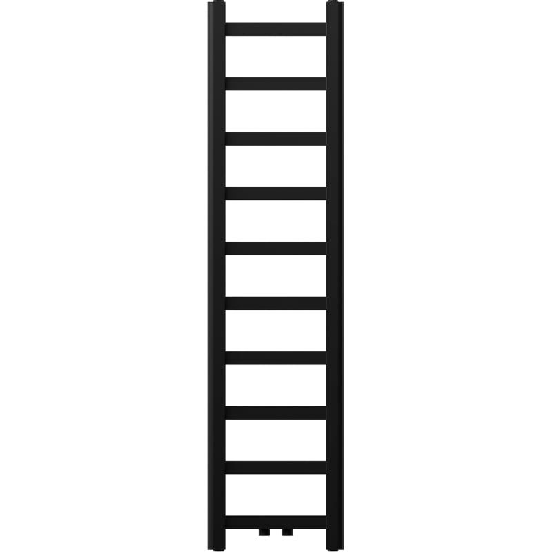 Technické údaje: Výška: 1200 mm Šířka: 300 mm Hloubka: 40 mm Rozteč připojení: - 25 cm (dole) nebo 5 cm (uprostřed) Barva: Černá RAL 9005 Materiál: Ocel Hmotnost: 5,05 kg Reakce na oheň: A1 Provozní teplota: max. 95 °C Maximální provozní tlak: 0,6 MPa Topný výkon: - 75/65/20 °C - 240 W Připojení: - 2xG ½″ uprostřed - 4xG ½″ shora a zdola na pravé nebo levé straně Možnost instalace topného tělesa Vysoce kvalitní, odolný, korozivzdorný nátěr Sada obsahuje: zavěšení, montážní sadu, záslepky a odvzdušňovací otvor