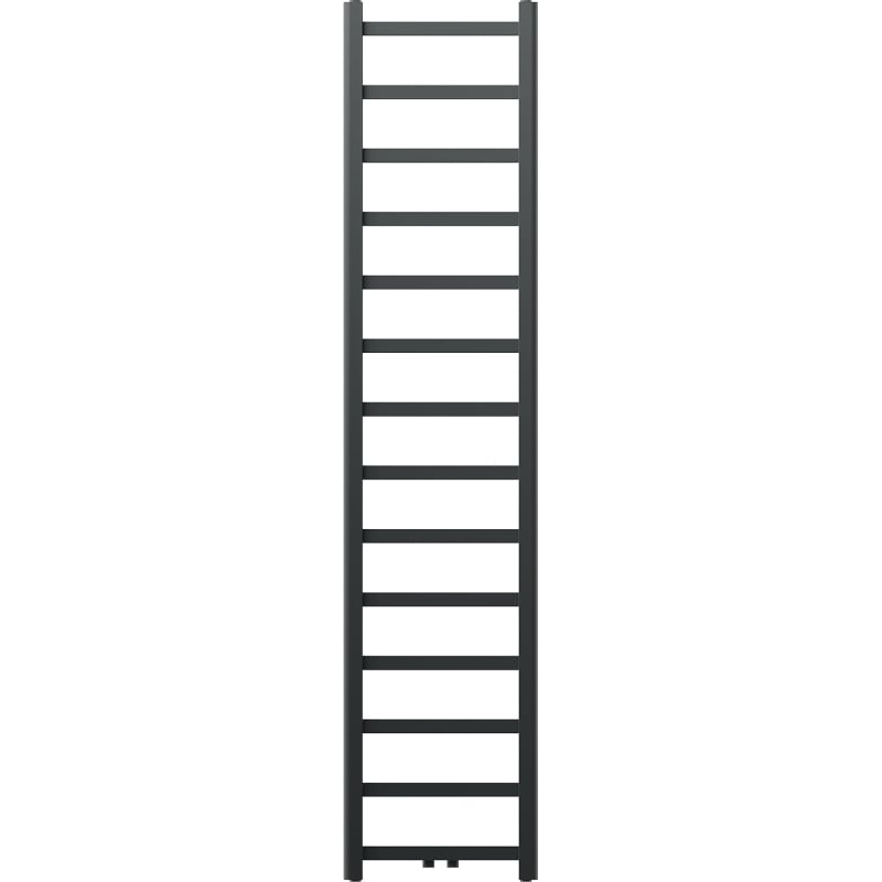Technické údaje: Výška: 1800 mm Šířka: 400 mm Hloubka: 40 mm Rozteč připojení: - 35 cm (dole) nebo 5 cm (uprostřed) Barva: Antracitová RAL 7016 Materiál: Ocel Hmotnost: 8,20 kg Reakce na oheň: A1 Provozní teplota: max. 95 °C Maximální provozní tlak: 0,6 MPa Topný výkon: - 75/65/20 °C - 406 W Připojení: - 2xG ½″ uprostřed - 4xG ½″ shora a zdola na pravé nebo levé straně Možnost instalace topného tělesa Vysoce kvalitní, odolný, korozivzdorný nátěr Sada obsahuje: zavěšení, montážní sadu, záslepky a odvzdušňovací otvor