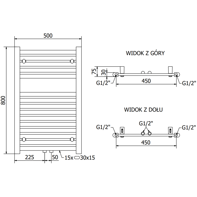 Technické údaje: Výška: 800 mm Šířka: 500 mm Hloubka: 30 mm Rozteč připojení: - 45 cm (dole) nebo 5 cm (uprostřed) Barva: Černá RAL 9005 Materiál: Ocel Hmotnost: 6,43 kg Reakce na oheň: A1 Provozní teplota: max. 95 °C Maximální provozní tlak: 0,6 MPa Topný výkon: - 75/65/20 °C - 386 W Připojení: - 2xG ½″ uprostřed - 4xG ½″ shora a zdola na pravé nebo levé straně Možnost instalace topného tělesa Vysoce kvalitní, odolný, korozivzdorný nátěr Sada obsahuje: zavěšení, montážní sadu, záslepky a odvzdušňovací otvor