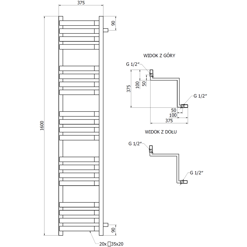 Technické údaje: Výška: 1600 mm Šířka: 375 mm Hloubka: 375 mm Rozteč připojení: - 45 cm (dole) Barva: Černá RAL 9005 Materiál: Ocel Hmotnost: 18,81 kg Reakce na oheň: A1 Provozní teplota: max. 95 °C Maximální provozní tlak: 0,6 MPa Topný výkon: - 75/65/20 °C - 837 W Připojení: - 4xG ½″ shora a zdola na pravé nebo levé straně Možnost instalace topného tělesa Vysoce kvalitní, odolný, korozivzdorný nátěr Sada obsahuje: závěsy, montážní sadu, záslepky a odvzdušňovací otvor