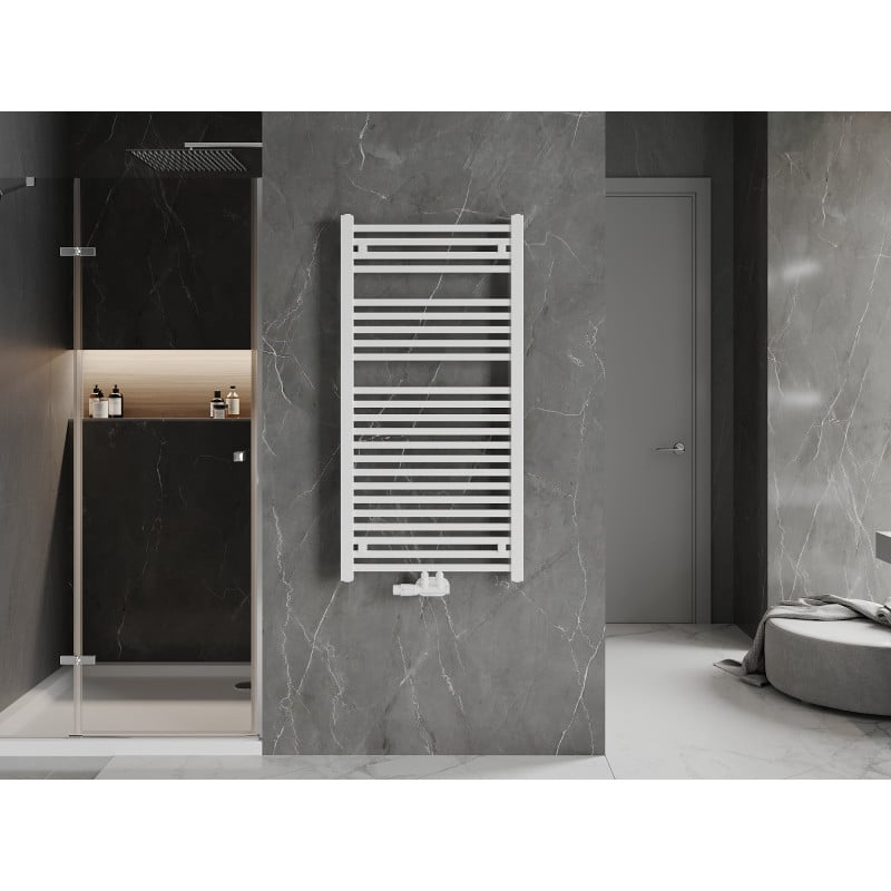 Technické údaje: Výška: 1200 mm Šířka: 600 mm Hloubka: 40 mm Rozteč připojení: - 56 cm (dole) nebo 5 cm (uprostřed) Barva: Bílá RAL 9016 Materiál: Ocel Hmotnost: 12,92 kg Reakce na oheň: A1 Provozní teplota: max. 95 °C Maximální provozní tlak: 0,6 MPa Topný výkon: - 75/65/20 °C - 726 W Připojení: - 2xG ½″ uprostřed - 4xG ½″ shora a zdola na pravé nebo levé straně Možnost instalace topného tělesa Vysoce kvalitní, odolný nátěr odolný proti korozi Sada obsahuje: závěsy, montážní sadu, záslepky a odvzdušňovací otvor