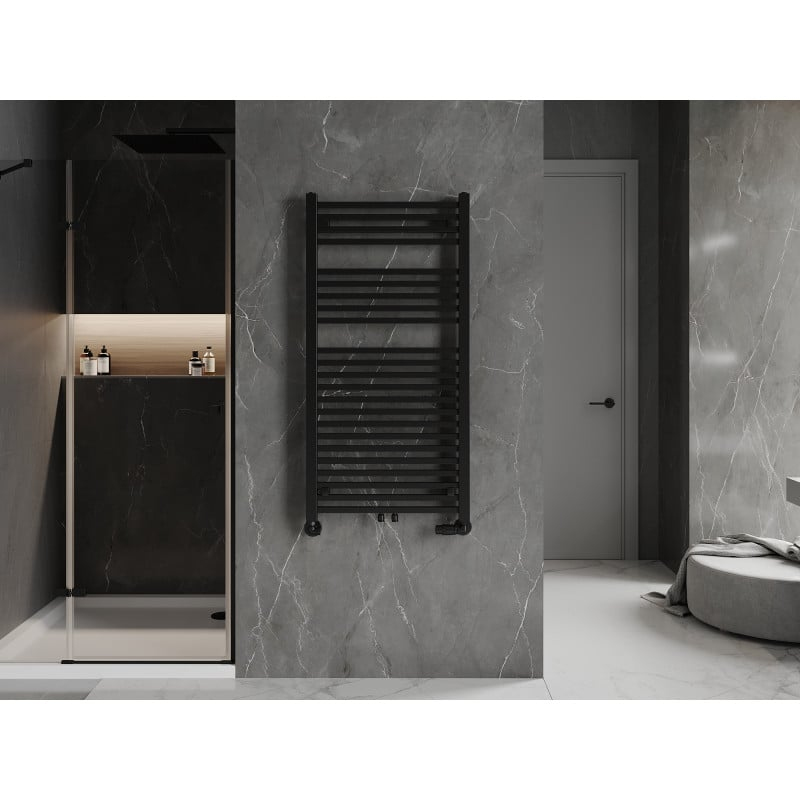 Technické údaje: Výška: 1200 mm Šířka: 600 mm Hloubka: 40 mm Rozteč připojení: - 56 cm (dole) nebo 5 cm (uprostřed) Barva: Černá RAL 9005 Materiál: Ocel Hmotnost: 12,92 kg Reakce na oheň: A1 Provozní teplota: max. 95 °C Maximální provozní tlak: 0,6 MPa Topný výkon: - 75/65/20 °C - 726 W Připojení: - 2xG ½″ uprostřed - 4xG ½″ shora a zdola na pravé nebo levé straně Možnost instalace topného tělesa Vysoce kvalitní, odolný nátěr odolný proti korozi Sada obsahuje: závěsy, montážní sadu, záslepky a odvzdušňovací otvor