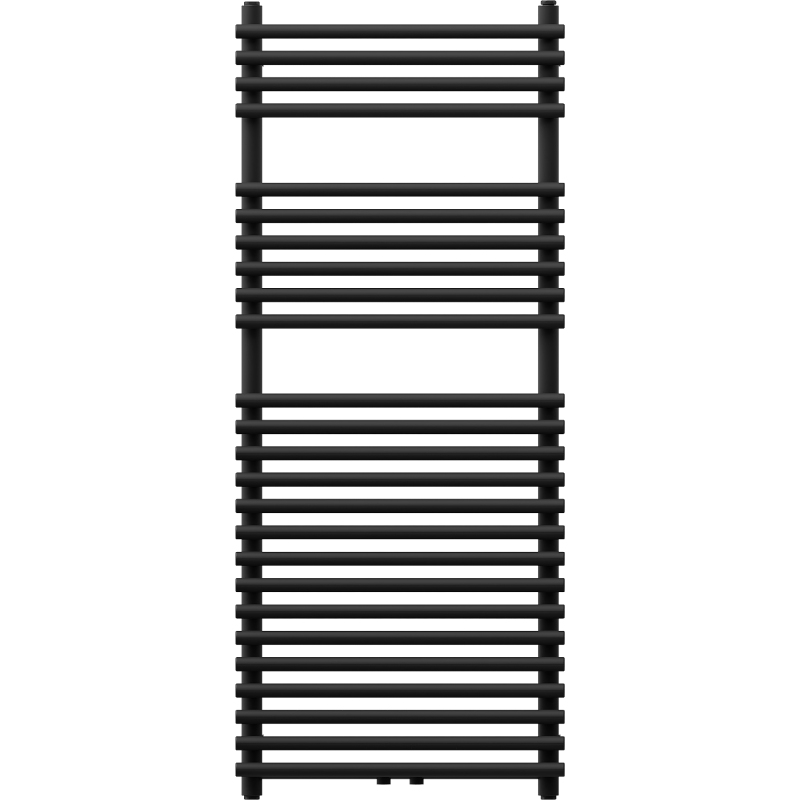 Technické údaje: Výška: 1200 mm Šířka: 500 mm Hloubka: 53 mm Rozteč připojení: - 45 cm (dole) nebo 5 cm (uprostřed) Barva: Černá RAL 9005 Materiál: Ocel Hmotnost: 10,51 kg Reakce na oheň: A1 Provozní teplota: max. 95 °C Maximální provozní tlak: 0,6 MPa Topný výkon: - 75/65/20 °C - 569 W Připojení: - 2xG ½″ uprostřed - 4xG ½″ shora a zdola na pravé nebo levé straně Možnost instalace topného tělesa Vysoce kvalitní, odolný, korozivzdorný nátěr Sada obsahuje: zavěšení, montážní sadu, záslepky a odvzdušňovací otvor