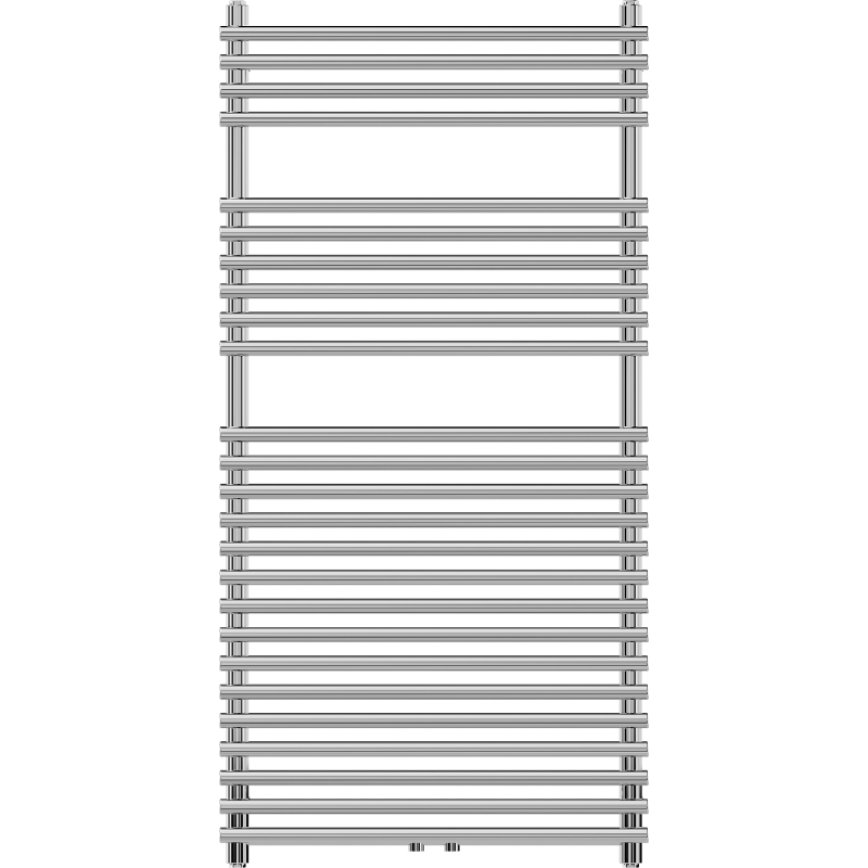 Technické údaje: Výška: 1200 mm Šířka: 600 mm Hloubka: 53 mm Rozteč připojení: - 55 cm (dole) nebo 5 cm (uprostřed) Barva: Chrom Materiál: Ocel Hmotnost: 11,78 kg Reakce na oheň: A1 Provozní teplota: max. 95 °C Maximální provozní tlak: 0,6 MPa Topný výkon: - 75/65/20 °C - 520 W Připojení: - 2xG ½″ uprostřed - 4xG ½″ shora a zdola na pravé nebo levé straně Možnost instalace topného tělesa Vysoce kvalitní, odolný nátěr odolný proti korozi Sada obsahuje: závěsy, montážní sadu, záslepky a odvzdušňovací otvor