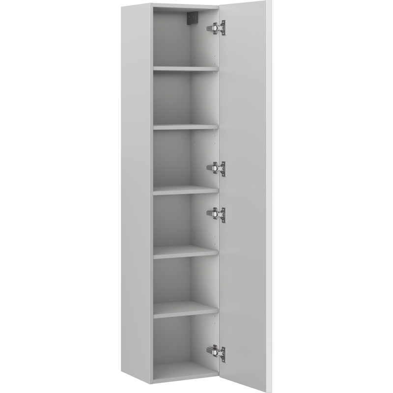 Specifikace produktu: Šířka: 35 cm Výška: 160 cm Hloubka: 30 cm Barva korpusu: Matně šedá Materiál korpusu: Lakovaná deska Barva čela: Matně šedá Materiál čela: Lakovaná MDF deska Konstrukce čela: Hladká Počet dvířek: 1 5 polic (1 pevná prostřední police a 4 nastavitelné police) Panty s funkcí tlumeného dovírání Univerzální montáž dvířek (levé/pravé) Povrch odolný vůči UV záření Smontovaný produkt