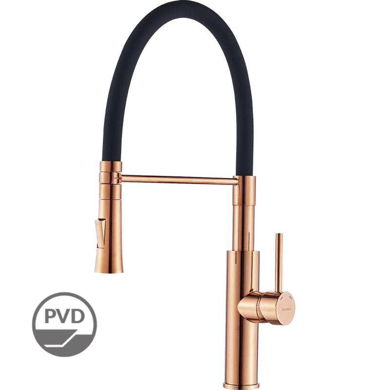 Shire sink mixers with movable spout apart from a reliable functionality can be characterised by a modern and elegant appearance. The mixers are fitted with ceramic cartridge 35mm and elastic silicone spout which allows water stream to be easily directed to any place in a sink or a vessel. Shire mixers will particularly suit frequently used kitchens where absence of a dishwasher forces more frequent washing-up or, e.g. rinsing vegetables. Two streams (constant and rain) which the mixer is provided with will make washing easier and contribute to a better comfort of work. Sink mixers with U-shaped spout are available in interesting colour versions, so all black, chrome, rose gold with black spout and gold with white spout. Modern design is a basic feature characterising Shire mixers.