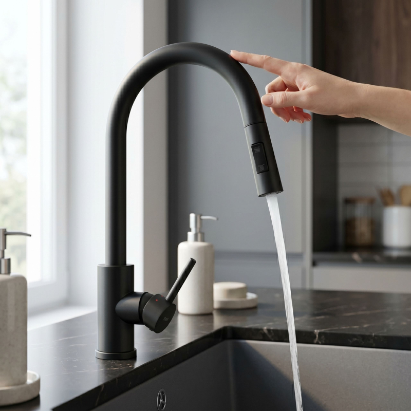 Spojte moderní design s funkčností díky kuchyňské baterii Rea Fresh Touch v elegantním černém provedení. Model je vybaven dotykovým systémem Touch, který umožňuje rychlé zapnutí a vypnutí vody dotykem výtoku – bez nutnosti použití rukou. Baterie má vytahovací výtok, který zvyšuje pracovní dosah a usnadňuje každodenní činnosti, jako je mytí nádobí nebo čištění dřezu. Díky dvoufukční spršce můžete pohodlně měnit režim proudu vody podle aktuálních potřeb.Systém Touch (dotykový) – umožňuje rychlé zapnutí a vypnutí vody dotykem výtoku.Senzor po celé délce výtoku – funguje kdekoli, bez nutnosti trefit konkrétní bod.Ovládání bez použití rukou – pomáhá zachovat vyšší úroveň hygieny při práci v kuchyni.Napájení 4 × bateriemi AA – není potřeba připojovat baterii k elektrické instalaci.Vytahovací výtok – zvyšuje pracovní dosah a usnadňuje mytí nádobí i čištění dřezu.Dvoufunkční sprška – umožňuje rychlou změnu režimu proudu vody.Otočný výtok 360° – zajišťuje volnost pohybu a pohodlí při používání.Jednopákové ovládání – umožňuje přesně nastavit teplotu a tlak vody.Moderní černý design – elegantní provedení vhodné do kuchyní ve stylu loft, modern a minimalistickém.Pevná konstrukce – zaručuje odolnost a dlouhou životnost při každodenním používání.Pevné tělo a moderní konstrukce zajišťují dlouhou životnost a pohodlí při používání, zatímco napájení senzoru pomocí 4 AA baterií eliminuje nutnost připojení k elektrické instalaci. Je to ideální řešení do moderních kuchyní, kde záleží na pohodlí, hygieně a rychlé obsluze.