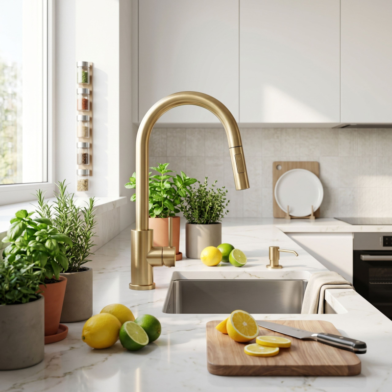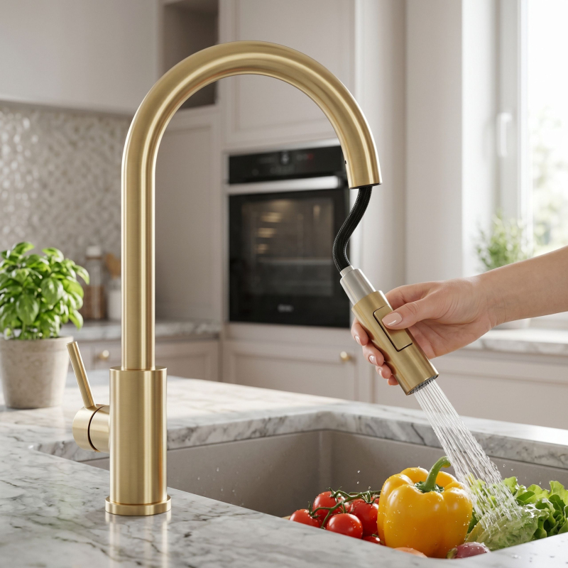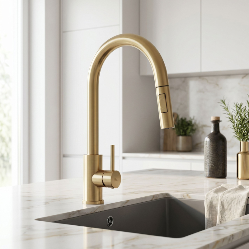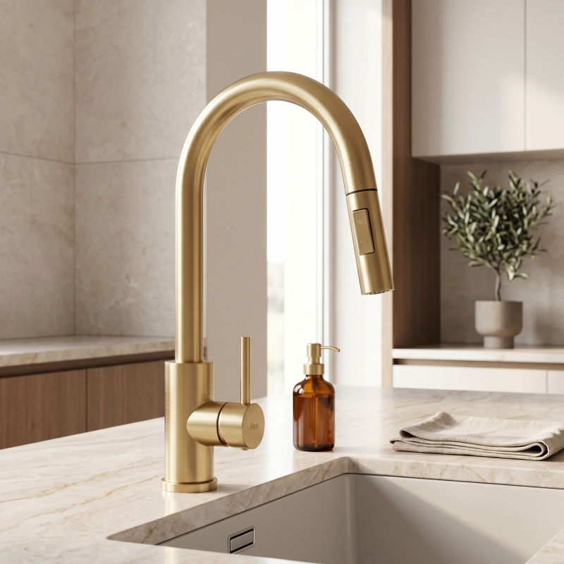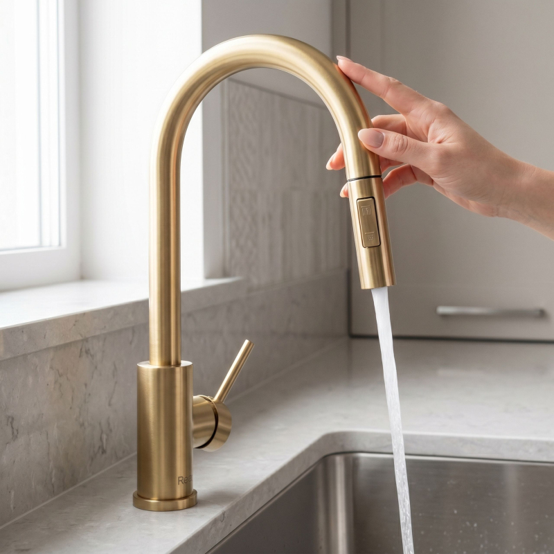 Spojte moderní design s funkčností díky kuchyňské baterii Rea Fresh Touch v elegantní povrchové úpravě Brushed Gold. Model je vybaven dotykovým systémem Touch, který umožňuje rychlé zapnutí a vypnutí vody dotykem výtoku – bez nutnosti použití rukou. Baterie má výsuvný výtok, který zvětšuje pracovní dosah a usnadňuje každodenní činnosti, jako je mytí nádobí nebo čištění dřezu. Díky dvoufunkční spršce můžete pohodlně měnit režim proudu vody podle aktuálních potřeb.Systém Touch (dotykový) – umožňuje rychlé zapnutí a vypnutí vody dotykem výtoku.Senzor na celém výtoku – funguje kdekoli, bez nutnosti zasáhnout konkrétní bod.Ovládání bez použití rukou – umožňuje udržovat větší hygienu při práci v kuchyni.Napájení 4 × AA baterie – není třeba připojovat baterii k elektrické síti.Výsuvný výtok – zvětšuje pracovní dosah a usnadňuje mytí nádobí a čištění dřezu.Dvoufunkční sprška – umožňuje rychlou změnu režimu proudu vody.Otočný výtok o 360° – zajišťuje volnost pohybu a pohodlí při používání.Jednopáková regulace – umožňuje přesně nastavit teplotu a tlak vody.Moderní kartáčovaný design – elegantní povrchová úprava Brushed Gold vhodná pro kuchyně v klasickém, moderním i glamour stylu. Povlak s technologií PVD je zárukou mnohonásobně vyšší odolnosti proti poškrábání, poškození a stálobarevnosti.Pevná konstrukce – zaručuje trvanlivost a odolnost vůči každodennímu používání.Pevné tělo a moderní konstrukce zajišťují odolnost a pohodlí při používání, zatímco napájení senzoru 4 bateriemi AA eliminuje potřebu připojení k elektrické síti. Je to ideální řešení pro moderní kuchyně, kde záleží na pohodlí, hygieně a rychlé obsluze.