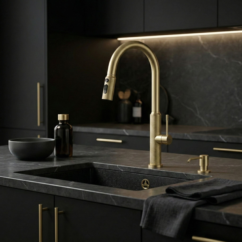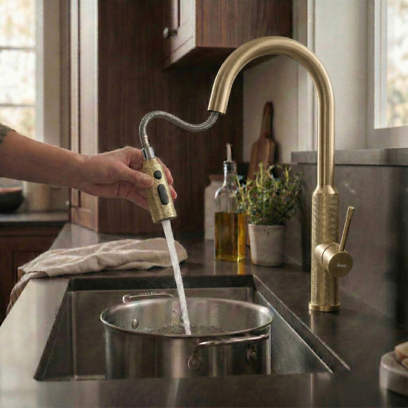 Kuchyňská baterie Rea Master v barvě kartáčovaného zlata spojuje luxusní design s pokročilou technologií, která promění Vaši kuchyni. Je vyrobena z masivní mosazi a povrchově upravena v teplém matném odstínu, takže jde o odolné a mimořádně estetické řešení pro ty, kdo oceňují reprezentativní vzhled armatur.Povrch Brushed Gold – baterie je opatřena povrchovou úpravou v barvě kartáčovaného zlata. Tato technologie zajišťuje vysokou odolnost proti poškrábání a zmatnění, přičemž saténový povrch účinně maskuje otisky prstů a usnadňuje údržbu.Výsuvná sprška – pohyblivý výtok na flexibilní hadici výrazně zvyšuje komfort při kuchyňských pracích. Umožňuje pohodlné mytí velkého nádobí, oplachování dřezu i napouštění vysokých hrnců umístěných přímo na pracovní desce.Přepínání proudu vody – ergonomický přepínač na výtoku umožňuje rychlou změnu režimu: z koncentrovaného nepřerušovaného proudu na rozptýlený sprchový proud, ideální pro šetrné oplachování ovoce a zeleniny.Mosazné tělo – konstrukce z kvalitní mosazi zaručuje stabilitu, dokonalou těsnost a dlouhou životnost baterie.Dekorativní vroubkování – charakteristickým detailem modelu Master je diamantová struktura na páce a koncovce výtoku. Protiskluzová úprava dodává baterii moderní vzhled a usnadňuje přesné ovládání i mokrou rukou.Baterie Rea Master Gold je ideální do kuchyní v moderním stylu, glamour i modern classic. Její teplý zlatý odstín a vysoká funkčnost zjednodušují každodenní úkony a dodávají zóně mytí výrazný, „šperkový“ charakter.