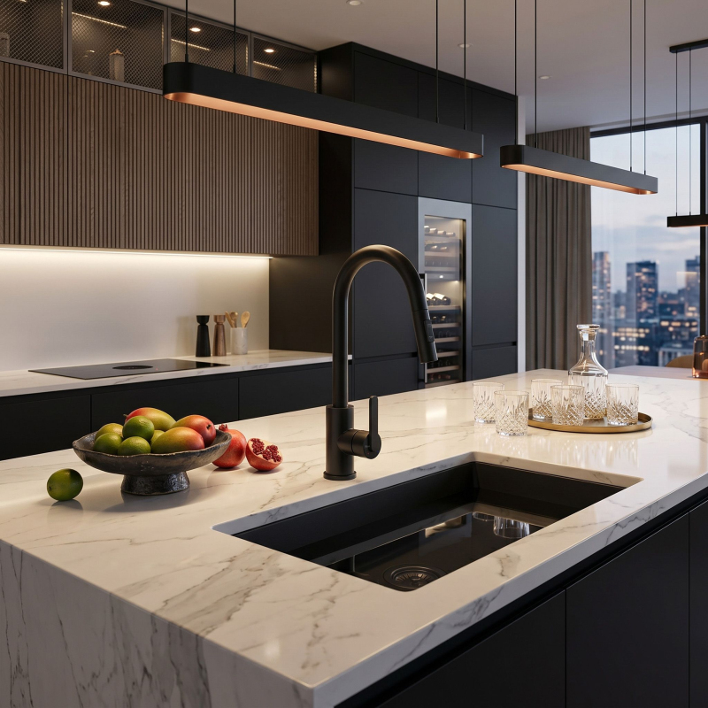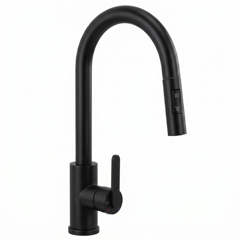 Kuchyňská baterie Ontario v hluboké matné černé barvě je spojením moderní ergonomie a výrazného designu. Byla navržena pro každodenní pohodlí a představuje elegantní a praktický prvek vybavení moderní kuchyně.Povrchová úprava Černý mat (Electroplating) – povlak nanášený pokročilou galvanickou metodou zajišťuje vysokou odolnost proti poškrábání a odlupování. Hluboká černá dodává interiéru moderní loftový charakter.Vytahovací výtok – flexibilní hadice s vytahovací koncovkou výrazně zvyšuje pracovní dosah, což usnadňuje mytí vysokého nádobí a čištění dřezu.Dva režimy proudu – tlačítko umístěné na hlavici umožňuje okamžitou změnu vodního proudu.Otočný výtok – pohyblivé rameno usnadňuje každodenní kuchyňské práce, což je důležité zejména u dvoudřezů.Solidní mosazné tělo – vyrobeno z vysoce kvalitní mosazi, což zaručuje stabilitu, odolnost proti korozi a spolehlivost po dlouhá léta.