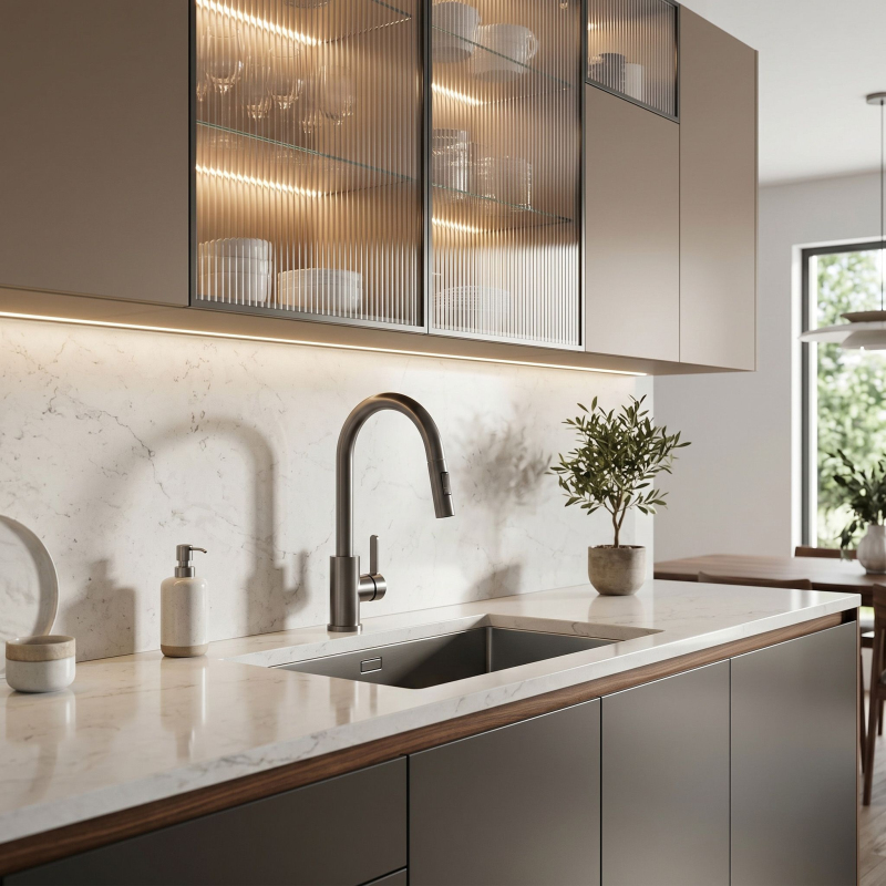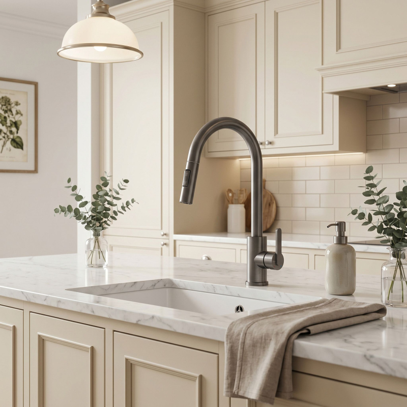 Kuchyňská baterie Ontario v barvě titanu je spojením moderní ergonomie a syrového industriálního designu. Byla navržena pro každodenní pohodlí a představuje elegantní a praktický prvek vybavení moderní kuchyně.Povrchová úprava Titan kartáčovaný (PVD) – pokročilý PVD povlak zajišťuje nejvyšší odolnost a rezistenci proti poškrábání. Tmavší ocelový odstín titanu dodává interiéru moderní charakter.Vytahovací výtok – flexibilní hadice s vytahovací koncovkou výrazně zvyšuje pracovní dosah, což usnadňuje mytí velkého nádobí.Dva režimy proudu – tlačítko na hlavici umožňuje rychlou změnu vodního proudu.Otočný výtok – pohyblivé rameno zajišťuje svobodu pohybu, což je důležité zejména u dvoudřezů.Solidní mosazné tělo – vyrobeno z vysoce kvalitní mosazi, což zaručuje stabilitu, odolnost a plnou ochranu proti korozi po léta používání.