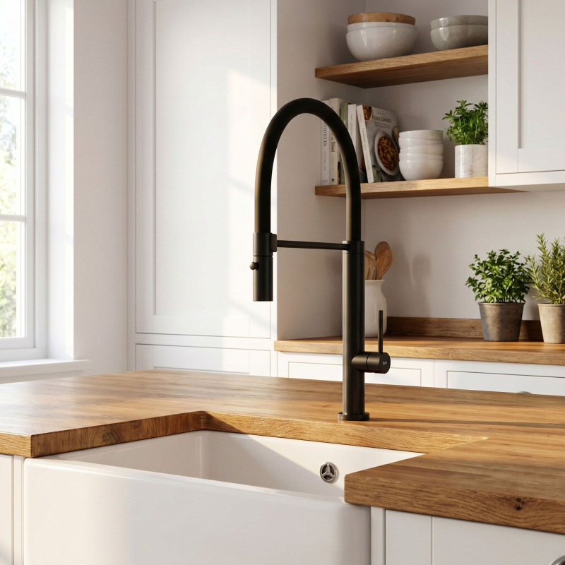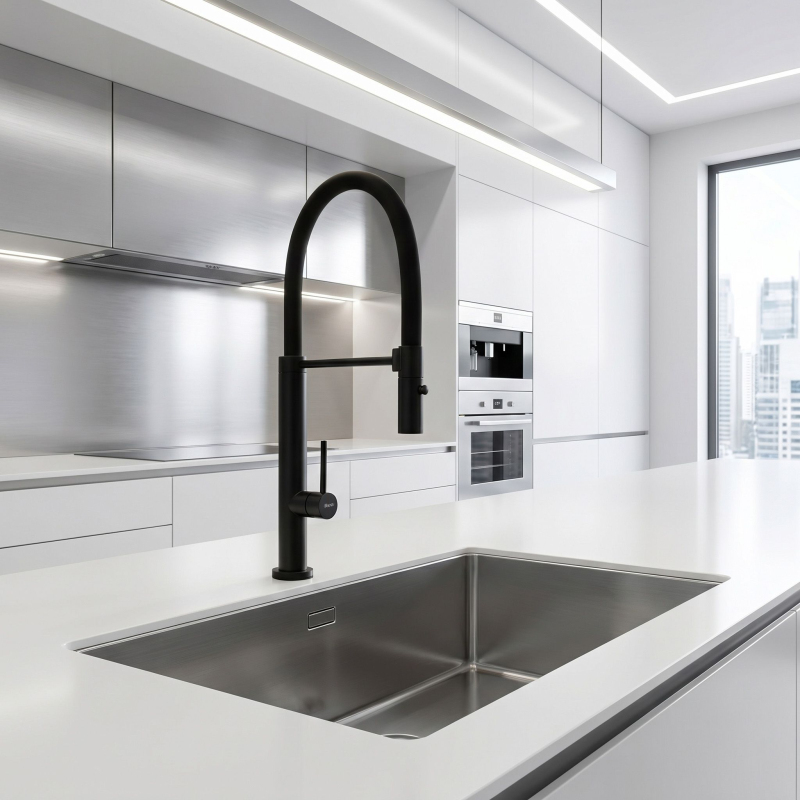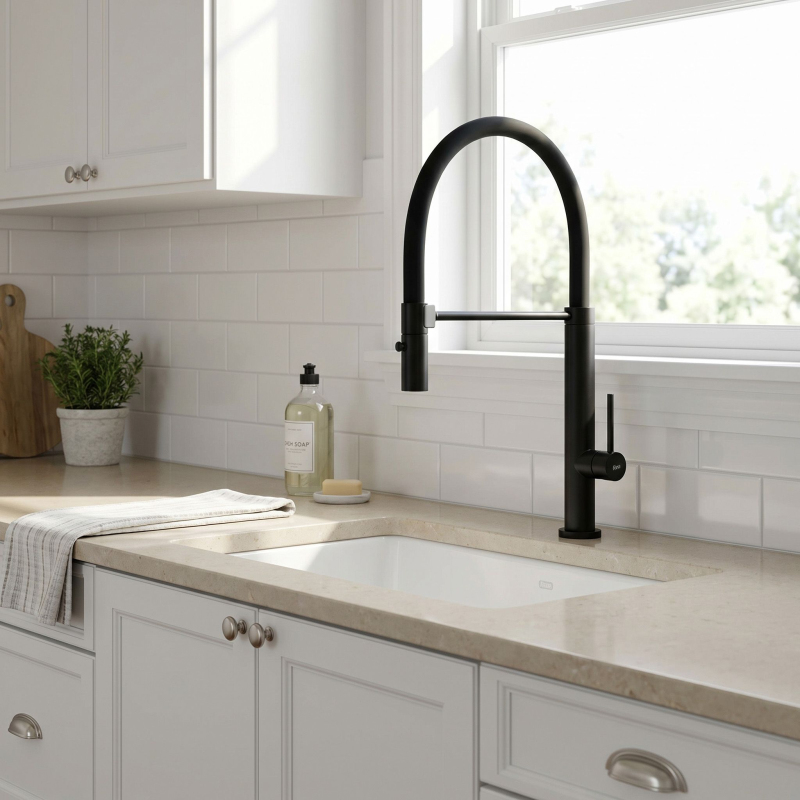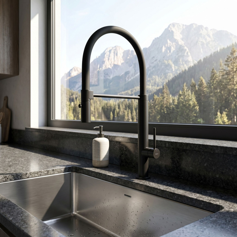 Kuchyňská baterie Rea Viera v provedení Černý mat je kvintesencí moderního stylu a nekompromisní funkčnosti. Její monolitická, tmavá silueta s flexibilním ramenem ideálně zapadá do nejnovějších interiérových trendů a tvoří dokonalý doplněk kuchyní v loftovém, industriálním i minimalistickém stylu. Je to model pro lidi, kteří oceňují výrazný design a profesionální technická řešení.Hluboký povrch Černý mat – sametově matná vrstwa dodává armatuře syrovou eleganci. Černá skvěle kontrastuje se světlými deskami nebo tvoří ucelenou kompozici s tmavým granitovým dřezem.Technologie práškového lakování – moderní metoda nanášení barvy zaručuje vysokou odolnost proti mechanickému poškození a odlupování, usnadňuje údržbu a dodává povrchu výjimečnou hladkost.Plná mobilita a dosah – ohebné, černé rameno s vysokou odolností umožňuje volné manévrování s proudem vody v rozsahu 360 stupňů. To umožňuje přesný přístup do každého koutu dřezu i pohodlné plnění velkých nádob.Dvoufunkční sprška – intuitivní tlačítko na hlavici umožňuje okamžitou změnu proudu: od provzdušněného, úsporného průtoku po silnou sprchu pro efektivní mytí.Solidní podpůrné rameno – horizontální držák stabilizuje výtok a zajišťuje jeho vždy ideální polohu a estetický vzhled pracovní zóny.Spolehlivá keramická kartuše – srdcem baterie je keramický modul, který zodpovídá za plynulou a přesnou regulaci tlaku a teploty vody.Mosazná konstrukce těla – vyrobeno z vysoce kvalitní mosazi, což zaručuje odolnost proti korozi, vysokému tlaku vody a dlouholetou životnost celé konstrukce.