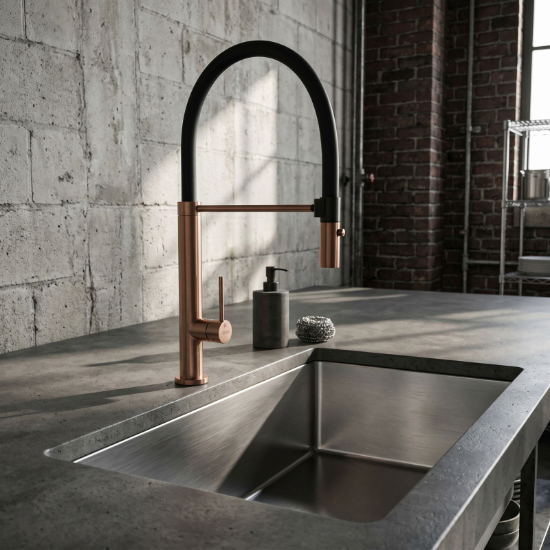 Kuchyňská baterie Rea Viera v odstínu Kartáčované mědi (Brushed Copper) je nabídkou pro ty, kteří chtějí do své kuchyně vnést teplé, jedinečné barvy a profesionální šmrnc. Její industriální konstrukce s flexibilním ramenem v kombinaci s luxusním měděným povrchem vytváří efektní dekorativní prvek, který se skvěle hodí do loftových, moderních i modern classic interiérů.Povrchová úprava Kartáčovaná měď – hluboký saténový odstín mědi dodává armatuře ušlechtilý vzhled. Kartáčovaná struktura je krásná i praktická – minimalizuje viditelnost zaschlých kapek.Technologie PVD – pokročilá metoda nanášení barev zajišťuje, že povrch je extrémně tvrdý a odolný proti poškrábání, což zaručuje barevnou stálost po léta.Plná mobilita výtoku – černá ohebná hadice umožňuje volné manévrování s proudem vody v rozsahu 360 stupňů.Měnitelný režim sprchy – koncovka výtoku je vybavena přepínačem funkcí mezi klasickým provzdušněným proudem a rozptýleným deštěm.Mosazné tělo a podpůrné rameno – robustní konstrukce zajišťuje stabilitu a horizontální rameno zaručuje, že se výtok vždy vrátí na své místo.Keramická kartuše – srdcem baterie je vysoce kvalitní keramický ventil zajišťující plynulou regulaci a těsnost.Výrazný kontrast – spojení teplé mědi s matnou černí hadice vytváří moderní a stylové duo.