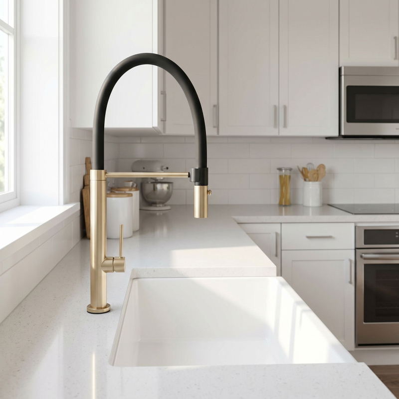 Kuchyňská baterie Rea Viera v provedení Kartáčované zlato je kvintesencí moderního designu v kombinaci s profesionální funkčností. Její štíhlá, vysoká silueta a kombinace ušlechtilého zlata s matnou černí dělají z této baterie centrální bod každé stylové kuchyně.Ušlechtilé Kartáčované zlato – matný, saténový povrch dodává armatuře luxusní charakter a díky technologii kartáčování je velmi praktický, protože maskuje skvrny od vody a otisky prstů.Inovativní PVD povlak – zlaté prvky jsou chráněny vakuovým PVD povlakem, který zaručuje extrémní odolnost proti otěru, korozi a ztrátě barvy.Flexibilní výtok typu “Spring” – černá, ohebná hadice na stabilním držáku umožňuje neomezený rozsah pohybu. Snadno dosáhnete do každého koutu dřezu.Dvoufunkční sprška – ergonomická koncovka výtoku má intuitivní tlačítko, které umožňuje měnit proud z provzdušněného na sprchový.Špičková keramická kartuše – zajišťuje plynulou a přesnou kontrolu nad teplotou a tlakem vody.Stabilní opěra výtoku – horizontální stabilizační rameno udržuje výtok v ideální poloze a zajišťuje estetický vzhled.Mosazná konstrukce – tělo z vysoce kvalitní mosazi je zárukou odolnosti a spolehlivosti.