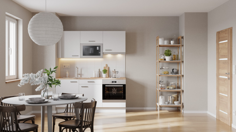 Kuchyňská linka Naturel s šířkou 180 cm. Linka je vyhotovena v lesklém provedení a s barvou dvířek bílá.