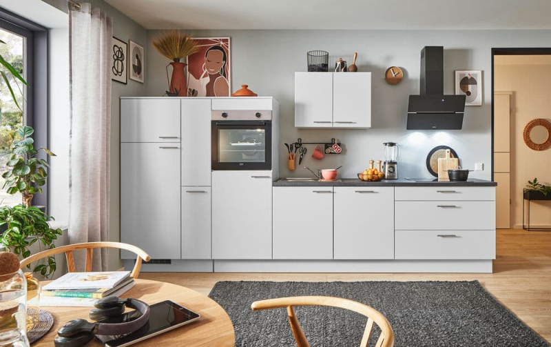Kuchyňská linka 370 cm, skříňky v světle šedé barvě, kompletně smontovaná, velmi snadná montáž, kompletní kuchyňská linka s vestavěnými spotřebiči, dřezem a dřezovou baterií, vyrobeno v Německu