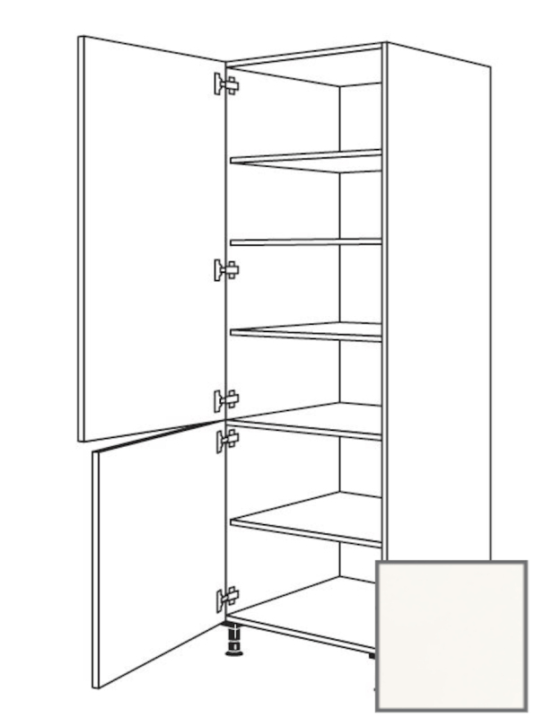 NĚMECKÁ KVALITA. Vysoká potravinová kuchyňská skříňka o šířce 60 cm s dvířky v barevném provedení bílá lesk. Barva korpusu v provedení bílá. Dvířka s plnou výplní.