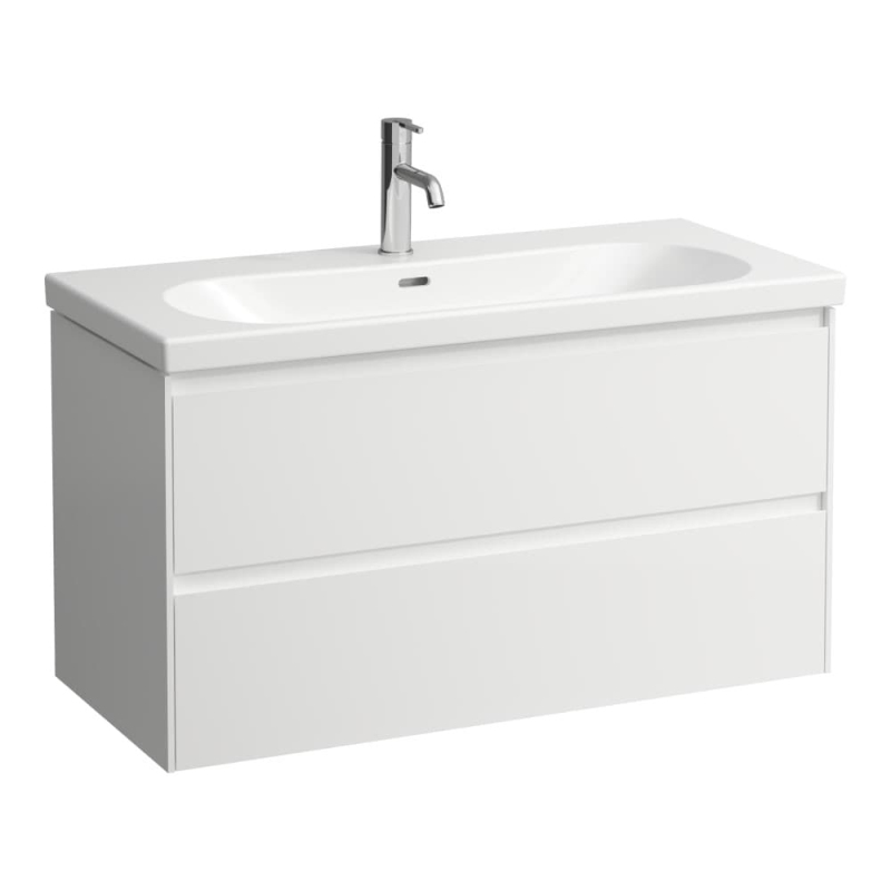 Závěsná koupelnová skříňka bez umyvadla v bílé barvě s matným povrchem o rozměru 98,5x51,5x45 cm. Povrch v provedení lamino. S plnovýsuvem a dotahem.