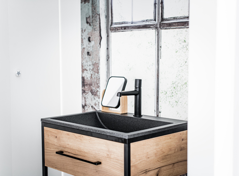 Černé 1-mísové vestavěné granitové umyvadlo.