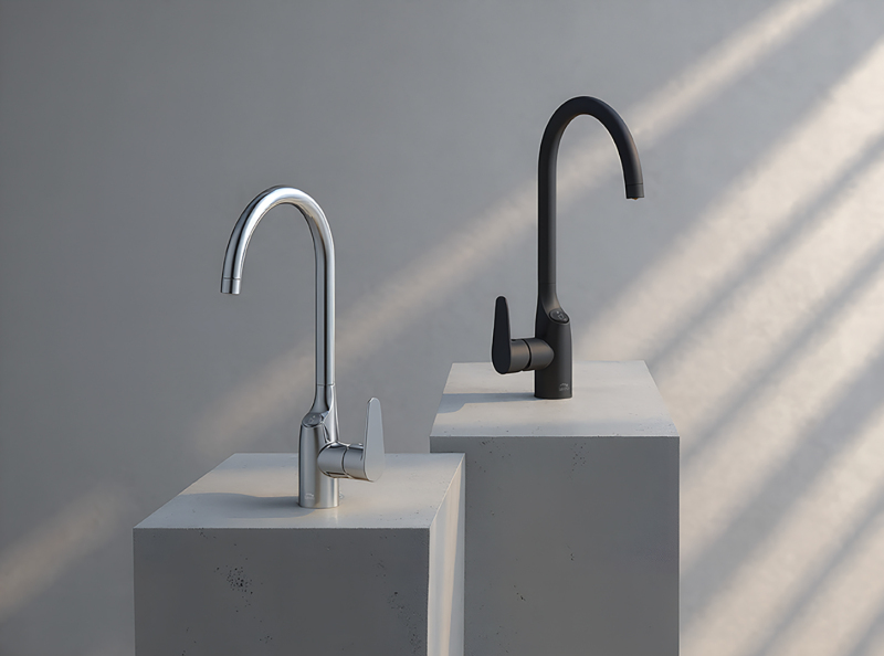 Otočný výtok s dosahem 20,5 cm usnadňuje mytí. Model je k dispozici ve dvou povrchových úpravách, chromované a černé.