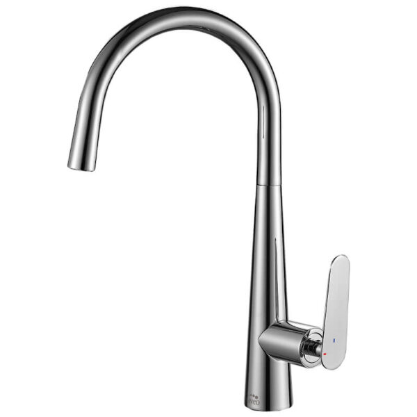 Stojánková dřezová baterie s U výtokem. Kohoutky mají takzvaný „studený start“, což znamená, že při spuštění proudu vytéká z hubice studený proud vody, který není smíchán. Tento jednoduchý mechanismus nám umožní snížit spotřebu teplé vody.