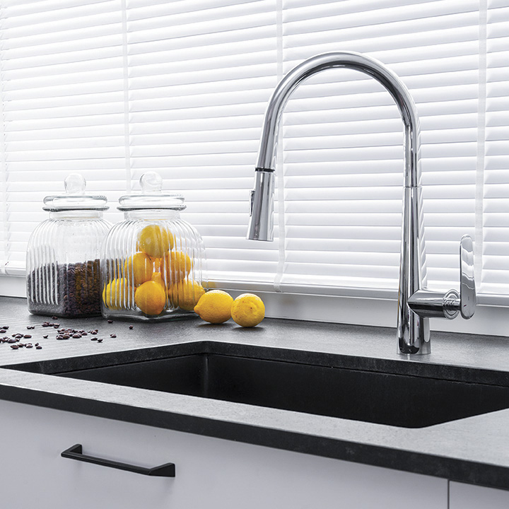 Charakteristický konec výtoku - kromě dekorativních vlastností skrývá praktický přepínač proudu vody z trvalého na deštivý, což je užitečné zejména při oplachování zeleniny a ovoce.