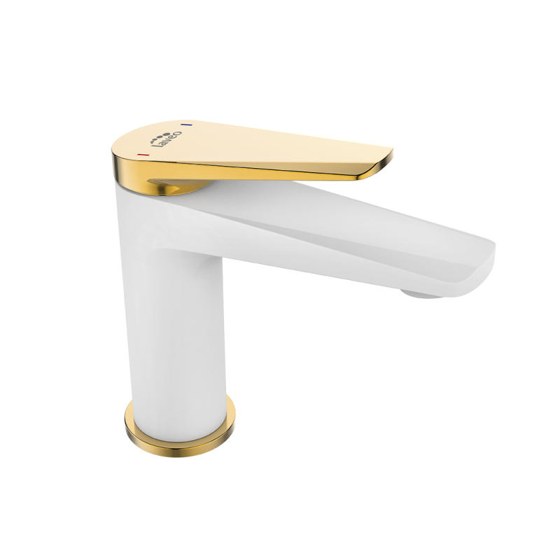 Umyvadlová baterie Rubio je určena pro instalaci do umyvadel. Zlatá páka v kombinaci s bílým tělem.