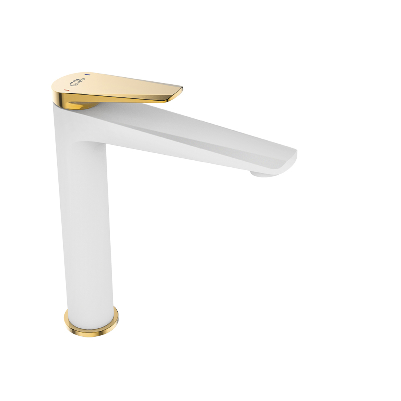 Vysoká umyvadlová baterie Rubio je model určený pro instalaci s umyvadly na desku. Zlatá páka v kombinaci s bílým tělem, každé zdobené charakteristickými zkoseními podobnými diamantovému šperku, činí model ideální pro zvýraznění moderní koupelny.