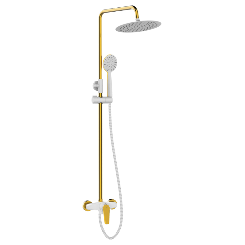 Sprchový sloup Rubio se zabudovanou baterií je kompletním řešením pro sprchový kout. Moderní kombinace zlaté lišty, páky a rozet s bílým tělem baterie, dešťovou sprchou a ruční sprchou působí originálním dojmem. Jedinečný design sloupku je zdůrazněn zkosením páky kohoutku a zploštělým subtilním tělem. Přepínání proudu vody je pohodlné díky speciálnímu třístupňovému kroužku namontovanému hned vedle páky.