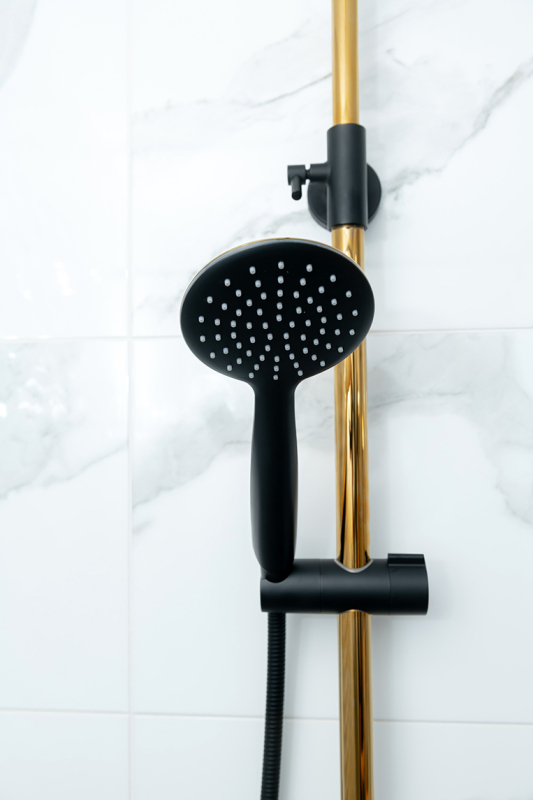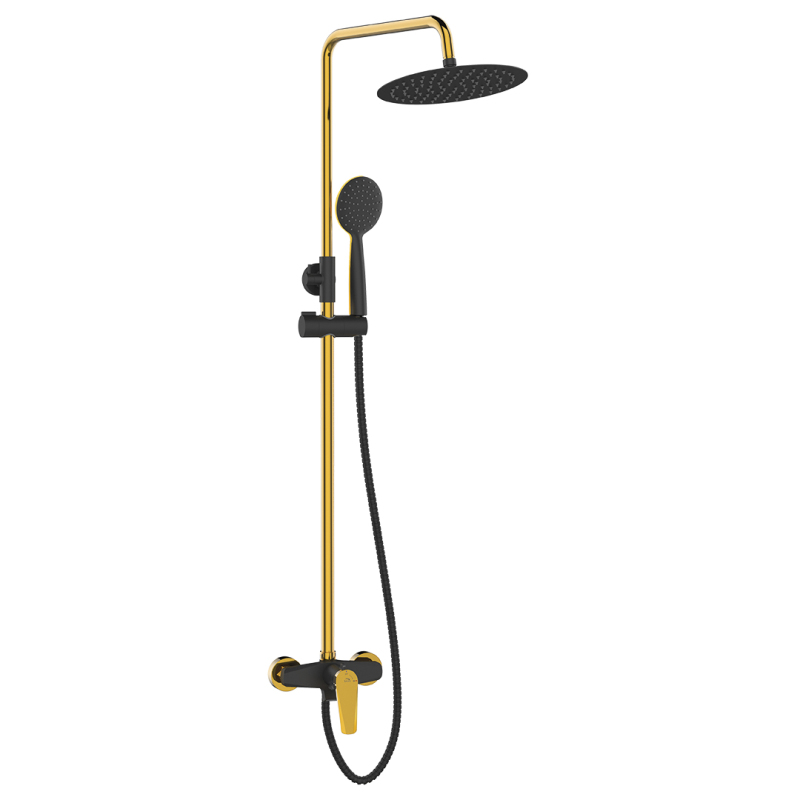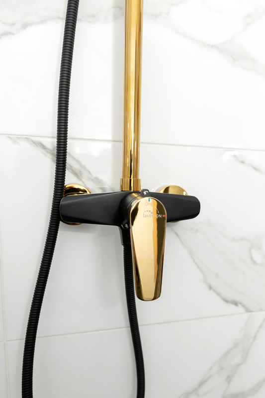 Sprchový sloup Rubio ve zlaté a černé barvě je esencí elegance. Kombinace dvou nejmódnějších a nejžádanějších interiérových barev zaručuje velkolepý efekt. Jedinečný design sloupku je zdůrazněn zkosením páky kohoutku a zploštělým subtilním tělem.