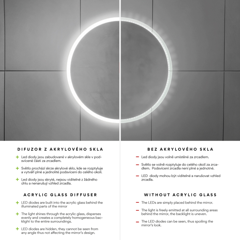 Konstrukce podsvícení: K rovnoměrnému rozptylu světla zrcadlo disponuje difuzorem z akrylového skla