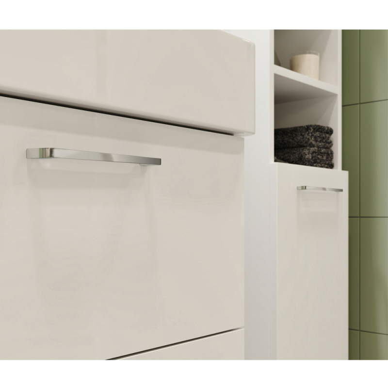Skříňka je závěsná, dodává se smontovaná a díky univerzálnímu designu se hodí do moderních i klasických koupelen. Minimalistické provedení a chromované úchytky ladí s jakýmkoliv interiérem a umožňují snadnou údržbu.