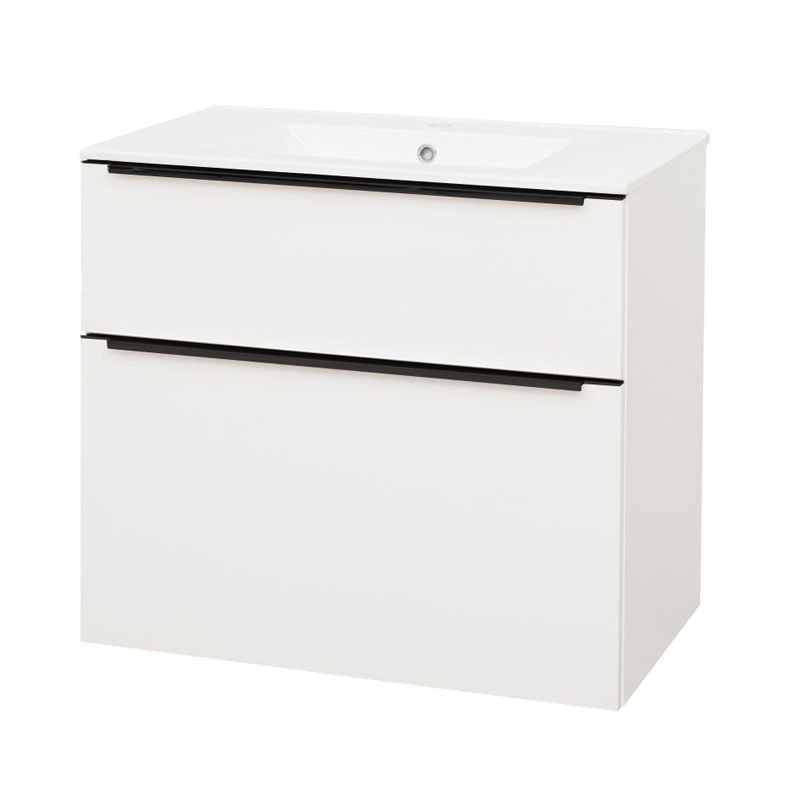 Mereo Mailo – koupelnová skříňka s keramickým umyvadlem 81 cm, bílá lesk, černé madlo