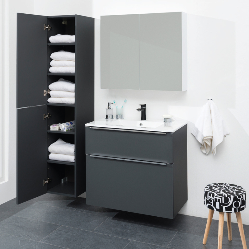 Jednoduchost, efektivnost, elegance. To jsou hlavní společné jmenovatele koupelnového nábytku, který ozdobí každou koupelnu. Skříňka obsahuje 2 dvířka za kterými se ukrývají 4 police. Vybírat můžete ze 2 typů otevírání (levé, pravé) a 3 barevných odstínů: lesklá bílá, dub Riviera a antracit. Otočením skříňky o 180 stupňů si určujete variantu otevírání (levou nebo pravou). Skříňka se dodává ve složeném stavu.