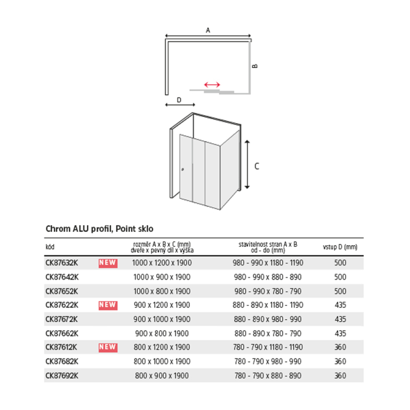 Hliníkové profily v barvě chrom, trojdílné zasunovací dveře a pevný díl, sklo Point, síla skla 6 mm, obdélník, rozměr 900 x 800 mm, výška 1900 mm.. Zobrazit více