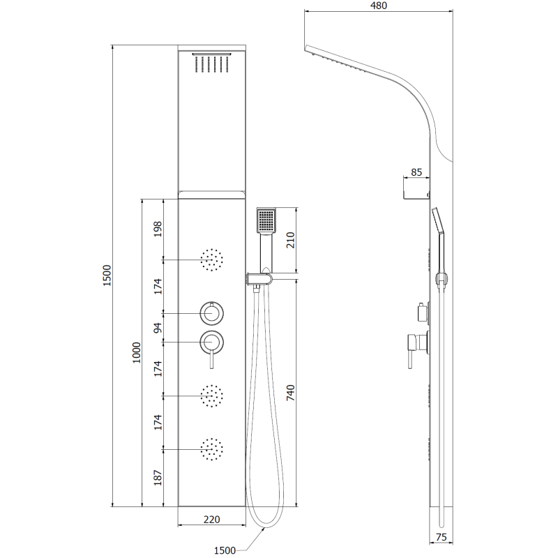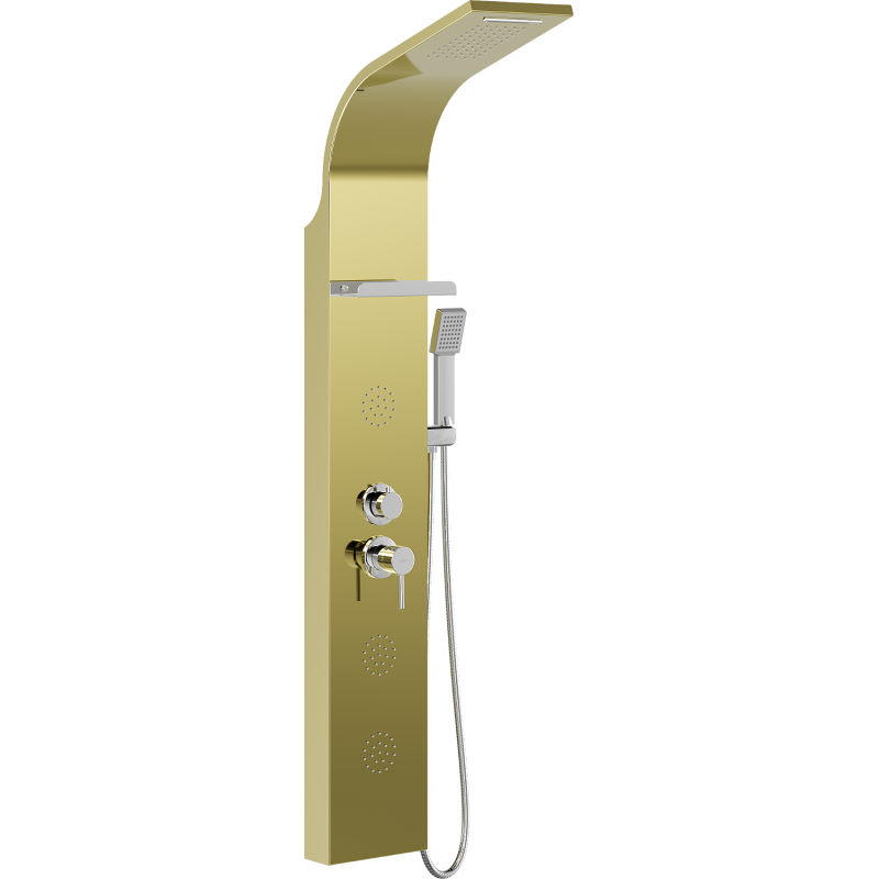 Specyfikacja produktu: Materiał: Stal nierdzewna Kolor: Złoty Wysokość: 148 cm Szerokość: 22 cm Ilość funkcji: 4 Praktyczna półka na kosmetyki Zintegrowana deszczownica Kaskadowy wypływ wody Słuchawka prysznicowa Wąż z osłoną ze stali nierdzewnej 150 cm Dysze silikonowe Anti-Calc ułatwiają usuwanie kamienia