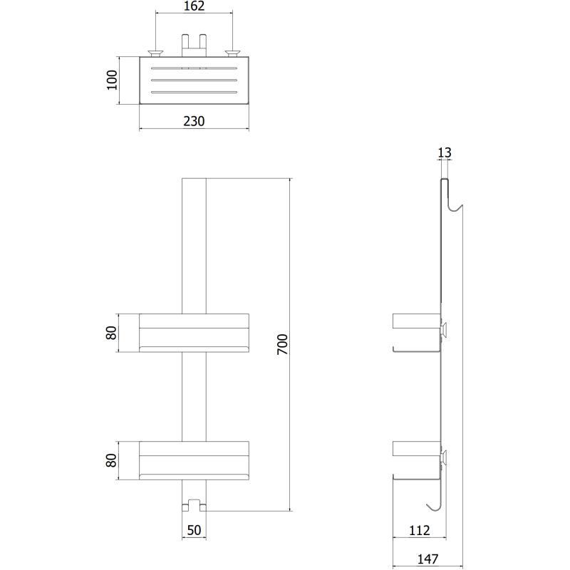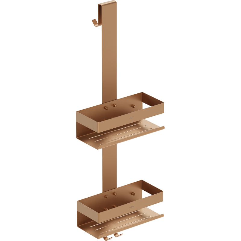 Specyfikacja produktu: Materiał: Stal nierdzewna AISI 304 Wykończenie: Miedź szczotkowana Szerokość: 23 cm Wysokość: 70 cm Odległość od ściany: 11,2 cm Liczba półek: 2 Pasuje do szyb prysznicowych o grubości nie większej niż 12 mm Półka posiada otwory, które zapewniają szybkie odprowadzanie wody Przyssawki zapewniające stabilność koszyka Haczyki z dwóch stron do powieszenia akcesoriów i ręczników Odporność na matowienie i korozję
