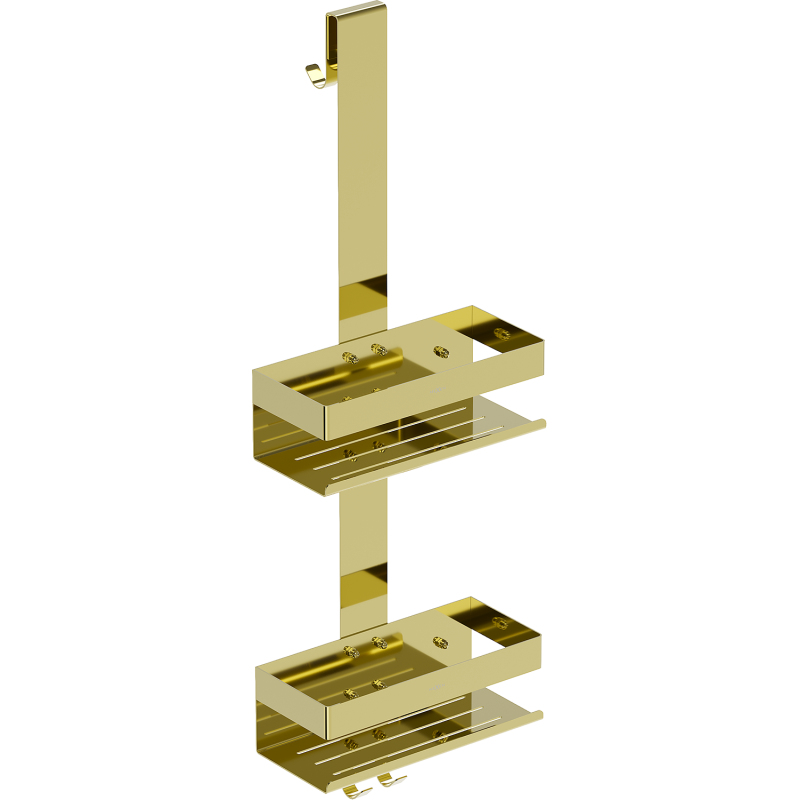 Specyfikacja produktu: Materiał: Stal nierdzewna AISI 304 Wykończenie: Złoty Szerokość: 23 cm Wysokość: 70 cm Odległość od ściany: 11,2 cm Liczba półek: 2 Pasuje do szyb prysznicowych o grubości nie większej niż 12 mm Półka posiada otwory, które zapewniają szybkie odprowadzanie wody Przyssawki zapewniające stabilność koszyka Haczyki z dwóch stron do powieszenia akcesoriów i ręczników Odporność na matowienie i korozję