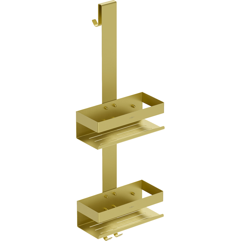 Specyfikacja produktu: Materiał: Stal nierdzewna AISI 304 Wykończenie: Złoty szczotkowany Szerokość: 23 cm Wysokość: 70 cm Odległość od ściany: 11,2 cm Liczba półek: 2 Pasuje do szyb prysznicowych o grubości nie większej niż 12 mm Półka posiada otwory, które zapewniają szybkie odprowadzanie wody Przyssawki zapewniające stabilność koszyka Haczyki z dwóch stron do powieszenia akcesoriów i ręczników Odporność na matowienie i korozję