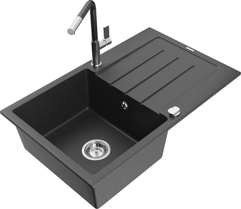 Mexen Bruno 1-miskový granit dřez s odkapem a baterií Flora, černá 6513-76-670401-08