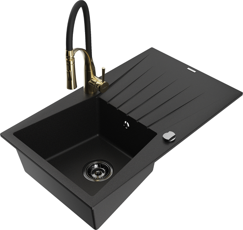 Mexen Cesar 1-miskový granit dřez s odkapem a baterií Aster, černá 6514-77-73450-57-B