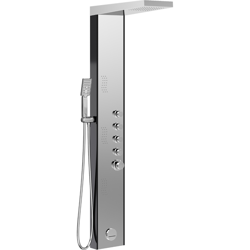 Specyfikacja produktu: Materiał: Stal nierdzewna Kolor: Chrom/Czarny Wysokość: 153 cm Szerokość: 22 cm Ilość funkcji: 4 Wylewka znajdująca się u dołu panela Zintegrowana deszczownica Słuchawka prysznicowa Wąż z osłoną ze stali nierdzewnej 150 cm Dysze silikonowe Anti-Calc ułatwiają usuwanie kamienia Brak możliwości regulacji ciśnienia wody, włączenie i wyłączenie strumienia z funkcją ON-OFF